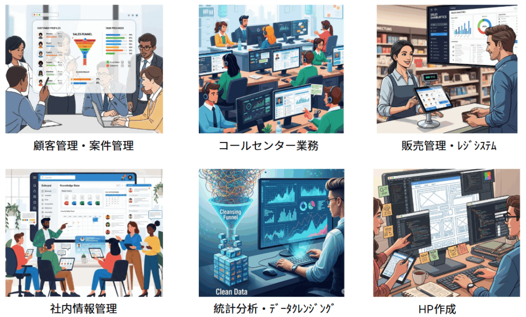 Salesforce、Kintone等のノーコード、ローコードツールを活用した業務効率改善に携わってきたスタッフが、各業務のプロセスを理解したうえで、最適な改善案をご提案し、構築から利用者へのご説明、運用保守まで一気通貫のサービスをご提供いたします。