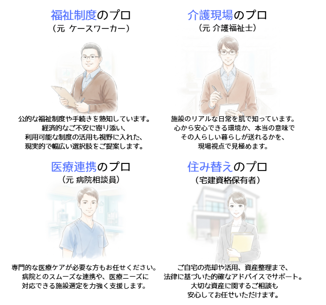 医療ソーシャルワーカー (MSW) 様やケースワーカー様のほか、地域包括支援センター・居宅介護支援事業所・生活福祉課など、医療・福祉の現場で働く皆さまの声から生まれた、「現場に寄り添う」施設紹介サポートです。